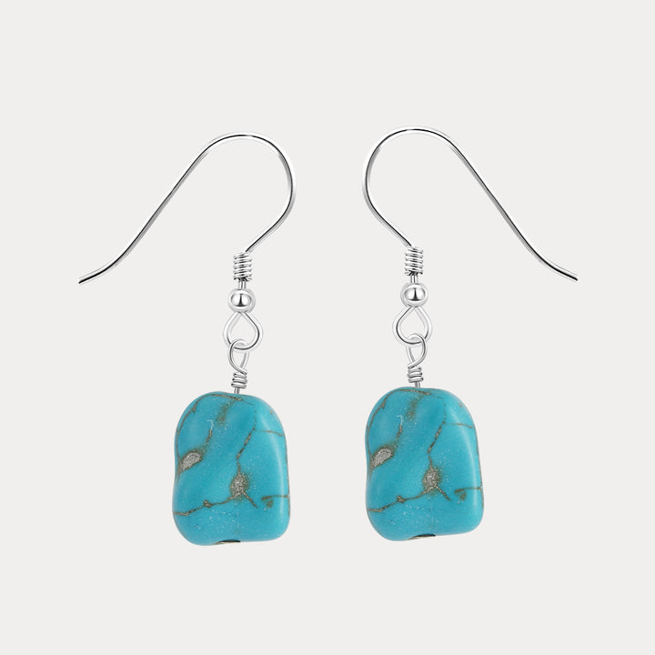 Step into timeless elegance with our Turquoise Gemstone Drop Earrings, a perfect fusion of natural beauty and refined craftsmanship. These captivating earrings feature vibrant turquoise stones, renowned for their distinctive blue-green hue and organic veining, set gracefully in 925 Sterling Silver. The smooth, rounded stones dangle delicately from gold-plated hooks, adding a touch of warmth and luxury to the design. What makes these earrings truly special is their ability to bring a splash of color and sophistication to any outfit. The natural turquoise, celebrated for its calming and protective properties, adds a sense of tranquility and style to your look.
