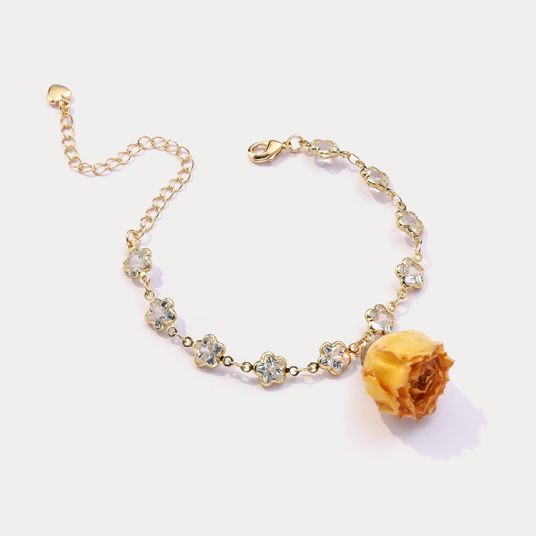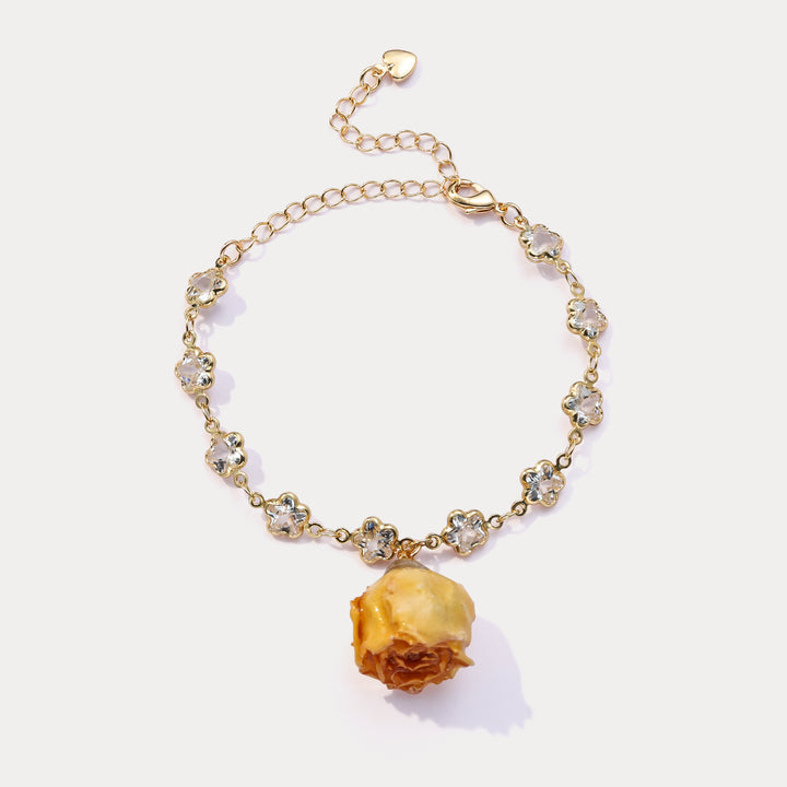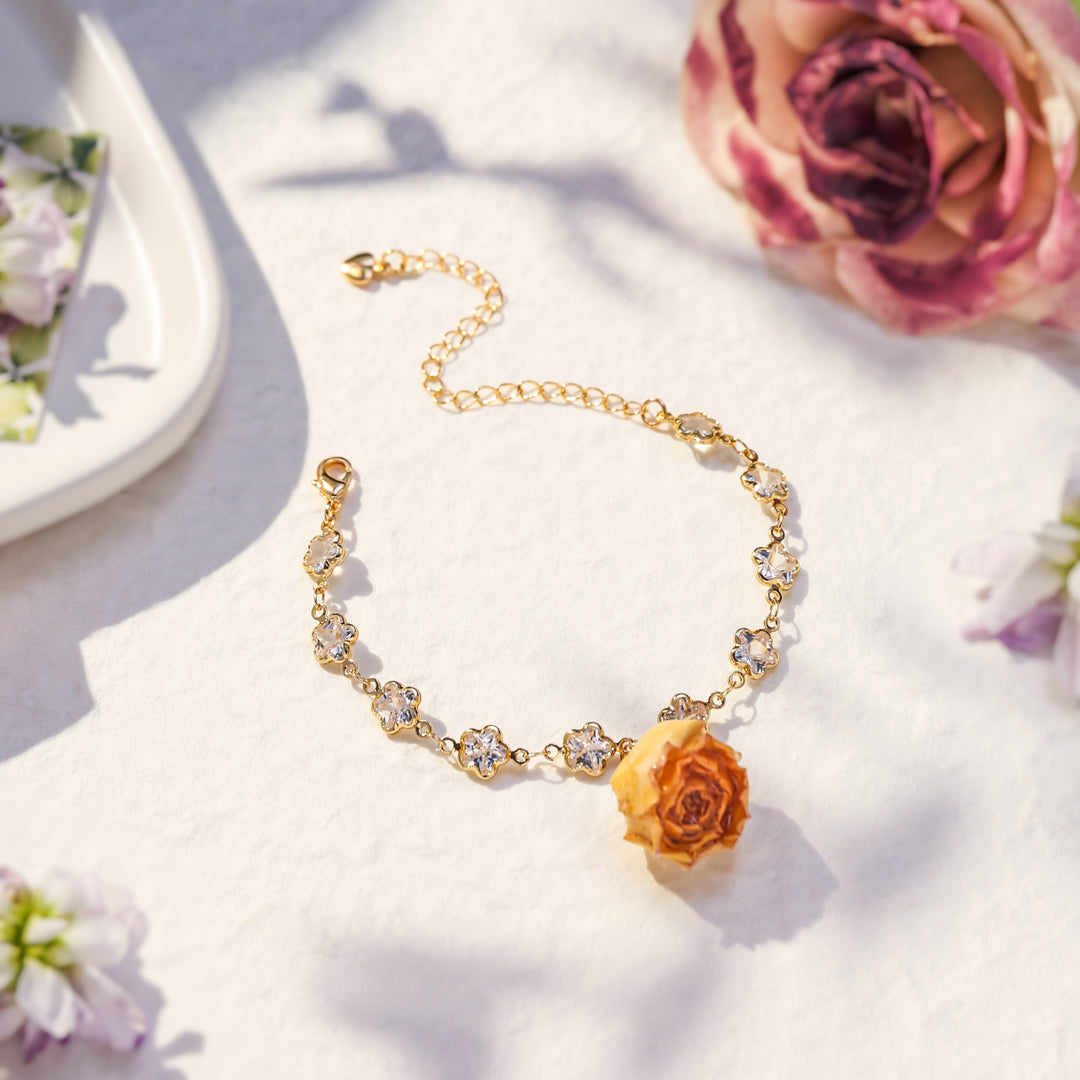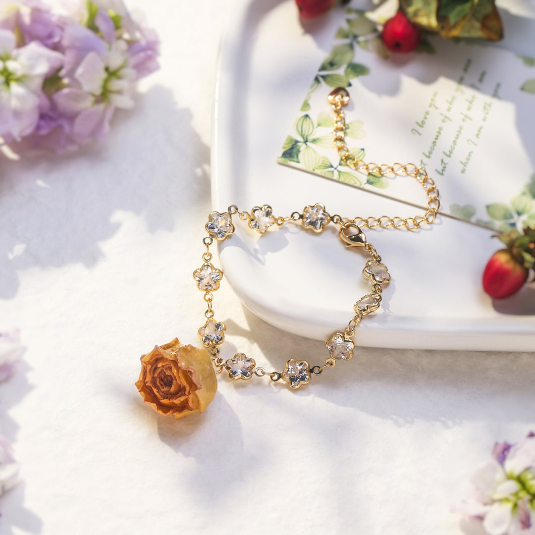 With a dried rose as the romantic centerpiece, the Dried Rose Beaded Bracelet captures the fleeting moment of a flower in bloom. A golden chain links shimmering four leaf crystals whose lively shine meets the natural dried rose pendant in a distinctive harmony. This dried flower bracelet features a heart shaped extension chain that fits different wrist sizes comfortably. Whether for daily wear or a date it adds a gentle tender vibe to any look. Like a flower that never fades this rose bead bracelet carries poetic sentiment on your wrist a meaningful gift for yourself or a loved one.