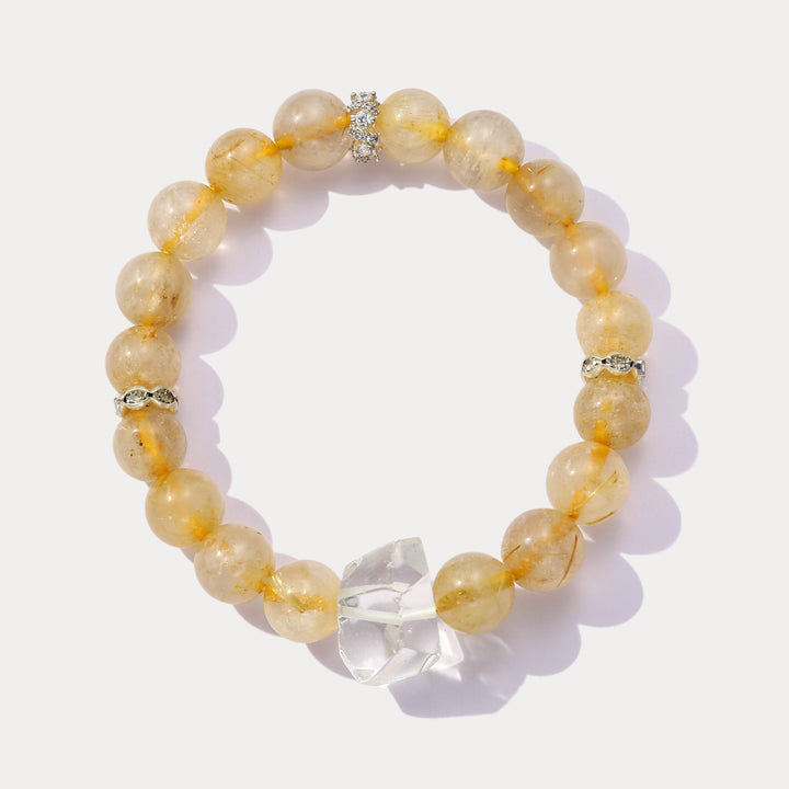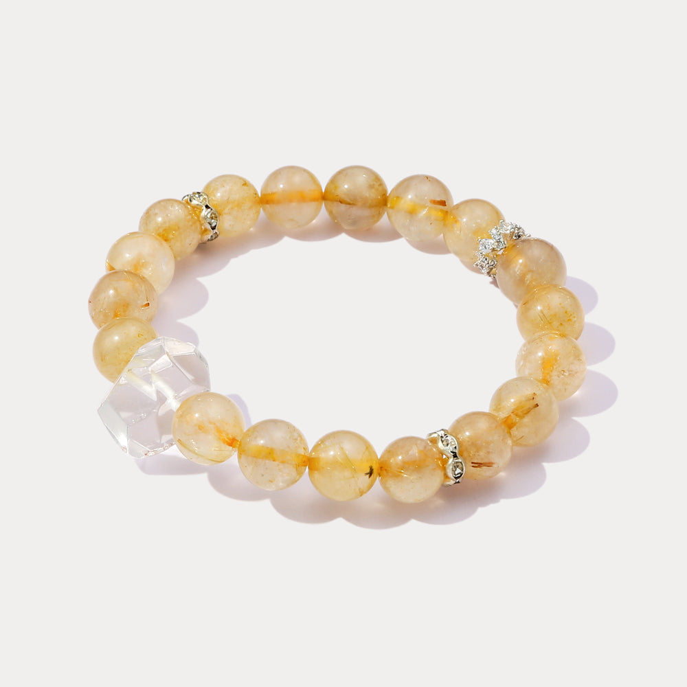 The Golden Rutilated Quartz Bracelet is a stunning accessory crafted from clear quartz stones intricately accented with shimmering golden rutile strands. Each bead showcases natural inclusions that create a unique, radiant sparkle, making this gold rutilated quartz bracelet a captivating addition to your jewelry collection. Beyond its striking appearance, the rutilated quartz bracelet embodies elegance, effortlessly elevating both casual and formal outfits. Its versatile design allows you to wear it alone for a subtle statement or layered with other pieces for a more dynamic look. Embrace the sophisticated charm and enduring beauty of genuine crystal with this exquisite bracelet that promises to draw admiration wherever you go.