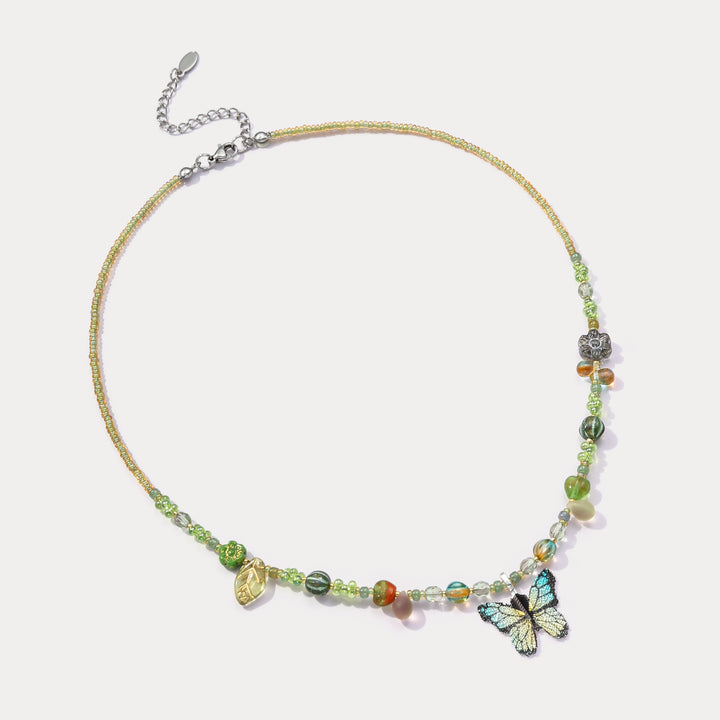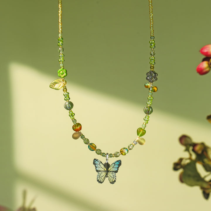 A stunning creation where nature and craftsmanship intertwine, this necklace is strung with Czech beads in vibrant shades of green that shimmer with rich ever changing hues like dappled light in a forest. Scattered among the beads are variously shaped accents reminiscent of lively musical notes. The butterfly pendant dazzles with dreamy colors that blend from pale blue to emerald green as if enchanted with every detail exquisitely lifelike like a forest sprite about to take flight. Wearing this green butterfly necklace adds a vivid lively touch to even the simplest outfit. Whether paired with a fresh pastoral dress or a sharp urban suit it instantly elevates your look as though draping the vitality and energy of a spring forest around your neck.
