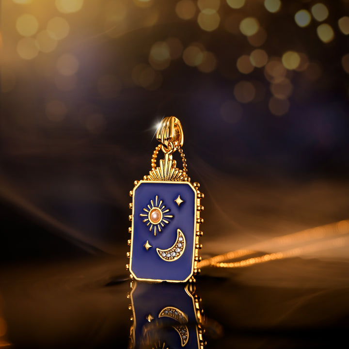 Step into a celestial dreamscape with the Blue Celestial Necklace, a masterpiece from our astrology-inspired collection. Envision a stunning array of blue discs, crafted with precision in 18K gold-plated brass, each one shimmering with the subtle allure of a cosmic night sky. The gold pendant necklace features an intricate blend of dripping oil, radiant shell inlays, and sparkling cubic zirconia, all harmoniously intertwined with the luster of artificial pearls and silver accents. This ethereal design captures the enchanting essence of the universe, offering a touch of stardust to elevate any ensemble. As you adorn yourself with this celestial treasure, you embrace a sense of cosmic wonder and timeless elegance, bringing the magic of the night sky into your everyday life.
