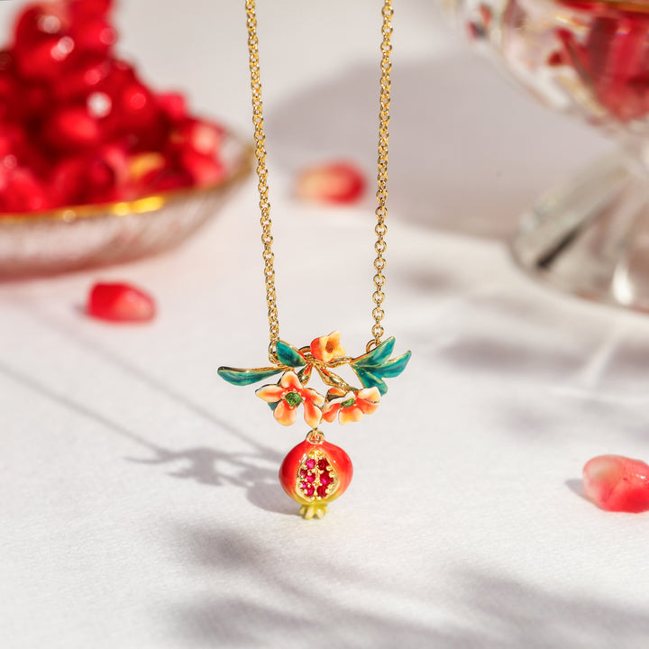The Pomegranate Flower Necklace features a delicate orange-pink blossom paired with a symbolic pomegranate pendant, representing prosperity, abundance, and happiness. Its elegant design highlights feminine charm while carrying heartfelt blessings. Perfect for everyday wear, dates, or as a meaningful gift for loved ones, it adds a touch of romance and elegance to any occasion. 👉 Shop More Fruit Jewelry.