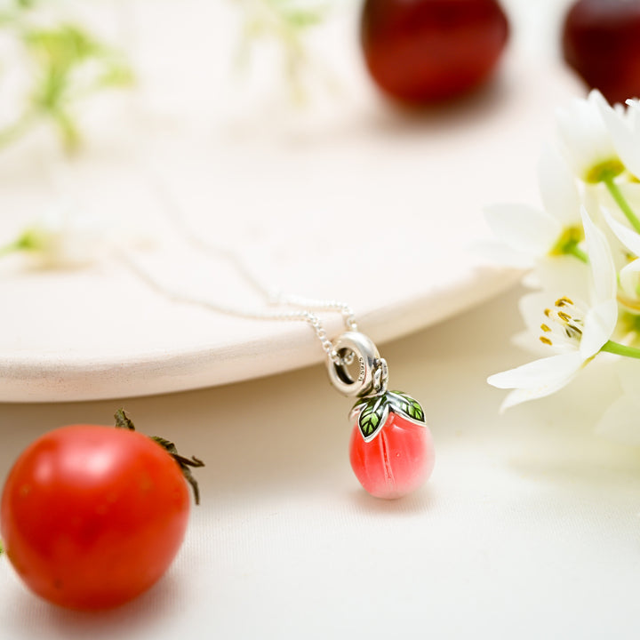 The Silver Peach Pendant Necklace is a delightful piece that captures the essence of summer and freshness. Crafted from high-quality silver, this charming pendant features a beautifully sculpted peach, designed in soft pink hues with lovely green leaf accents that enhance its whimsical appeal.