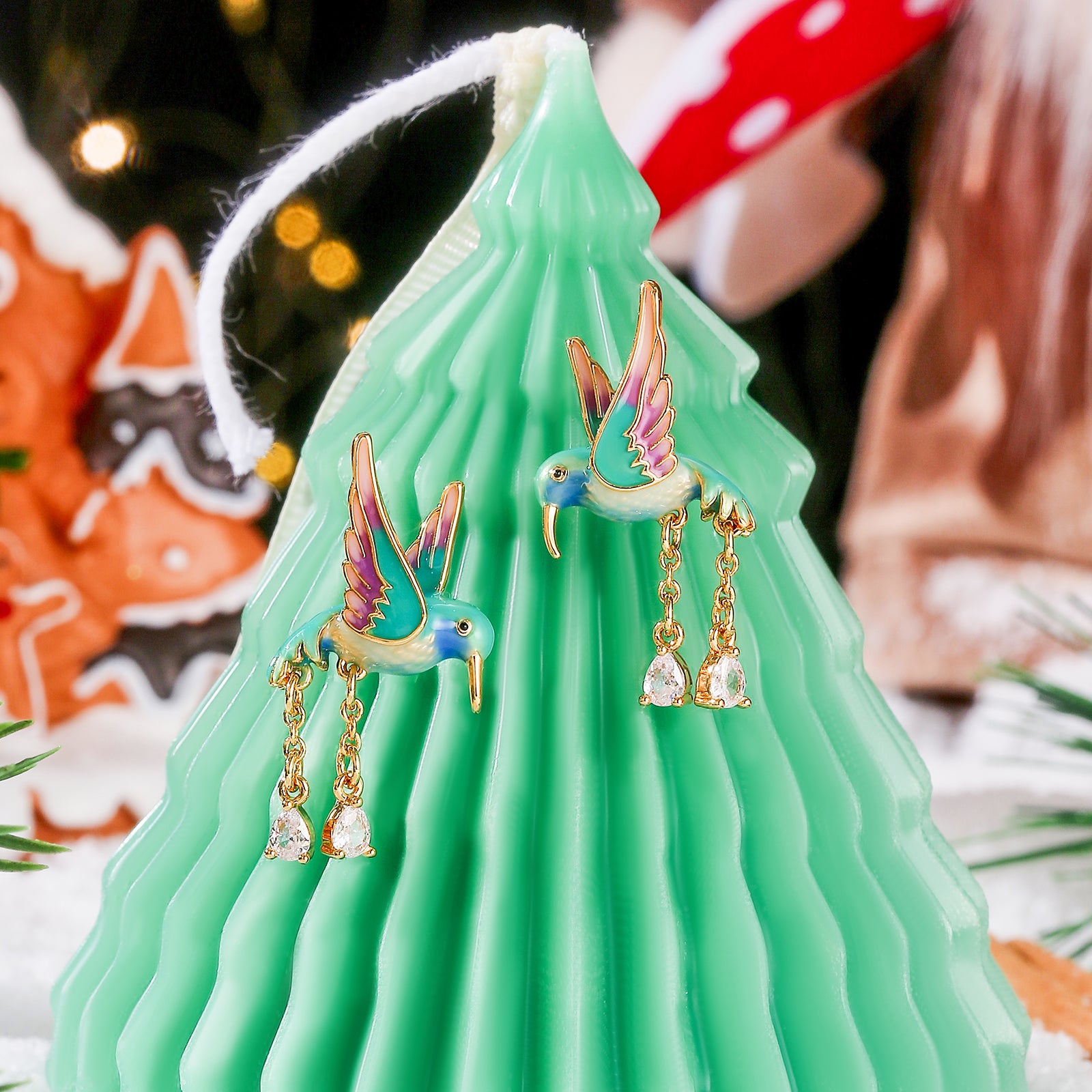 Infuse your style with a touch of nature's magic through our Enamel Hummingbird Earrings, a pair that captures the vibrant energy and delicate beauty of the hummingbird in mid-flight. These earrings feature intricately designed hummingbird motifs, with wings poised as if ready to take off, showcasing a captivating blend of blue and green enamel that shimmers with life. Each hummingbird is meticulously crafted from 18K gold on brass, offering a luxurious backdrop that enhances the vivid colors of the enamel. Let these earrings be the sparkling accent that highlights your love for both style and the natural world.