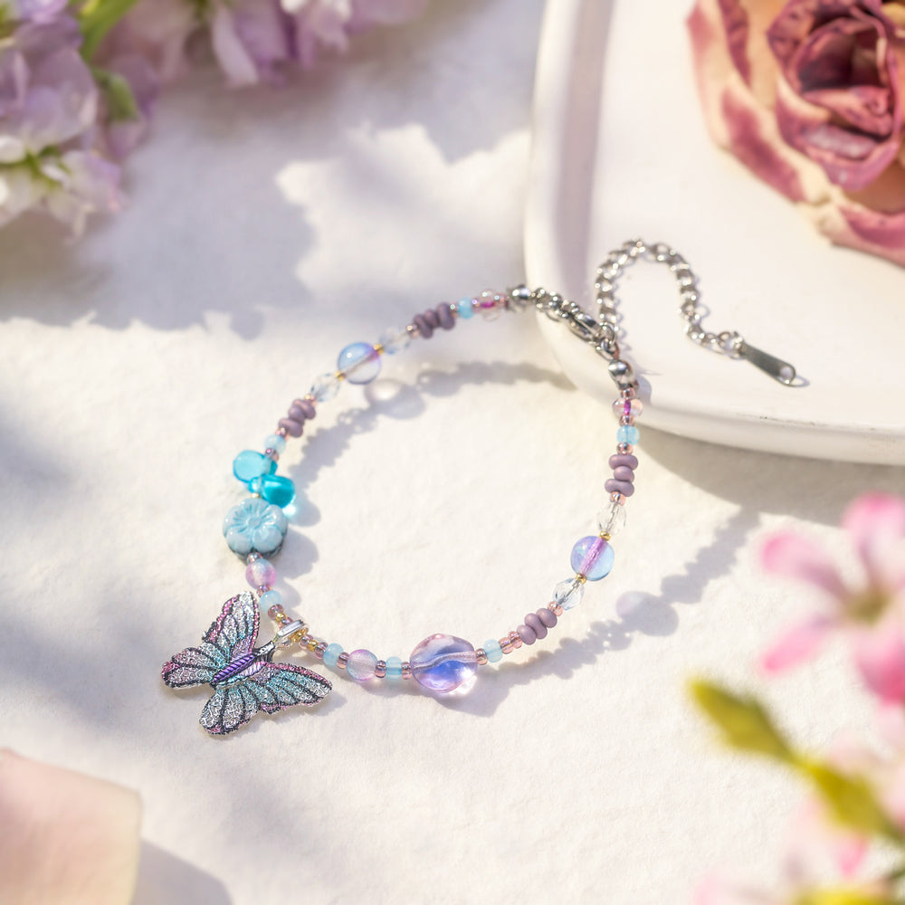 Like a dreamy galaxy dancing lightly on the wrist, the Czech Bead Butterfly Bracelet blends deep and light blue purple Czech beads that resemble mysterious nebulae under the night sky, with clear crystal beads scattered like twinkling stars. Unique floral beads add a playful touch to the mystery. The most captivating feature of this purple butterfly bracelet is the butterfly pendant, its colorful wings seemingly enchanted, crafted with exquisite detail as if ready to flutter into the vast galaxy at any moment. An adjustable chain fits different wrist sizes. Whether paired with a simple black evening gown for an elegant and regal look or with a casual denim outfit for a hint of charm and romance, this butterfly bracelet instantly becomes the highlight of any style, letting you shine with unique brilliance in any crowd.