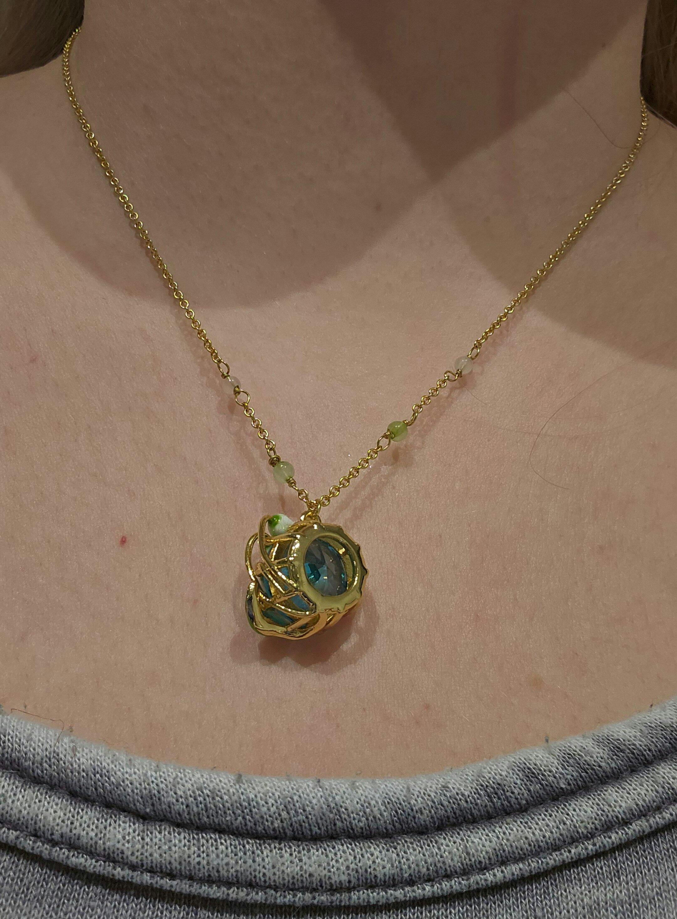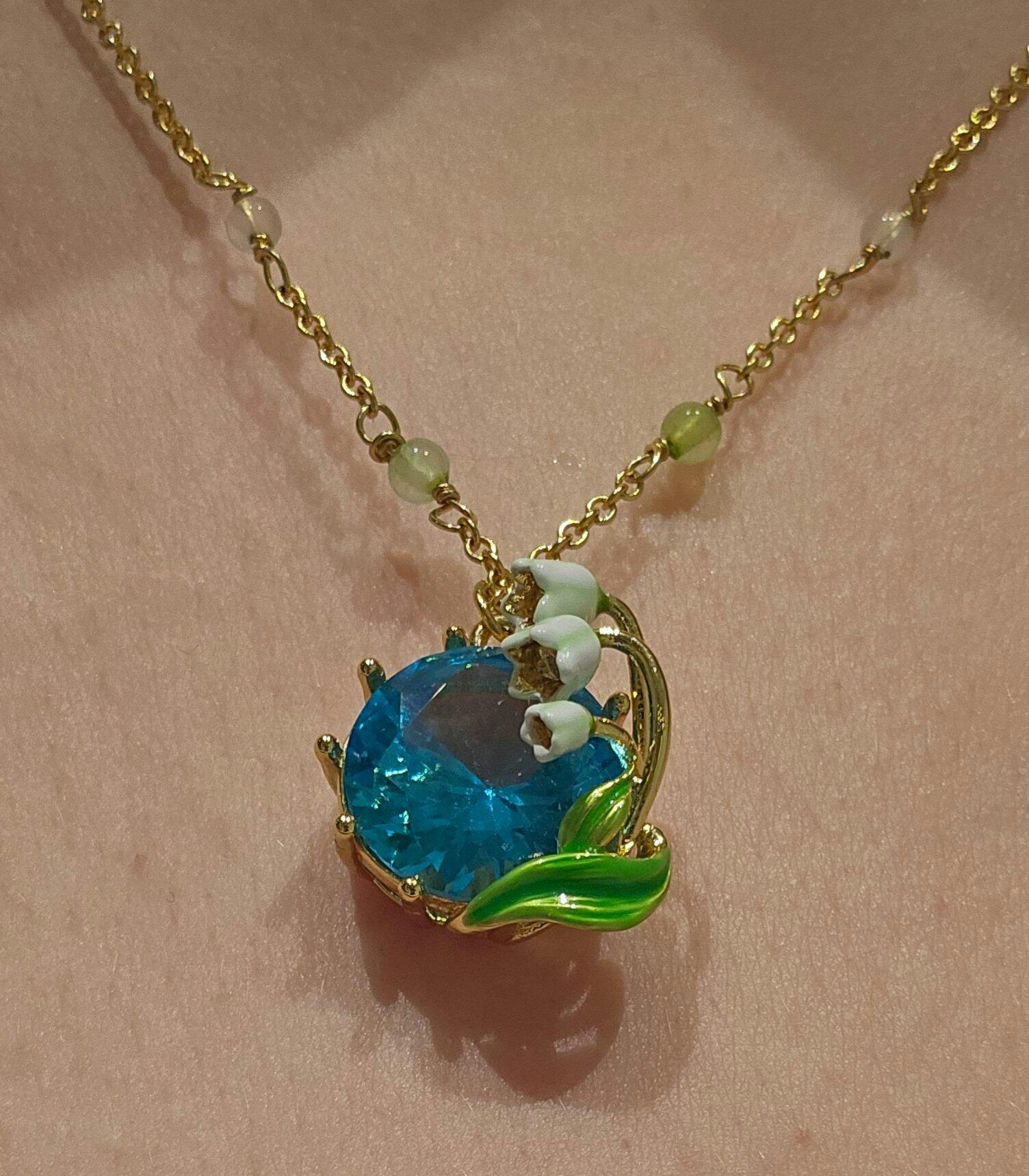 Strung on an 18K gold chain as delicate as strands of sunlight, dewy green and milky white beads shimmer like morning droplets on fresh leaves. At the center, an aquamarine stone reflects the calm depth of the sea, its blue surface alive with gentle ripples, like a dream shaped by wind and water. Framing the gem, enamel lily of the valley blooms in snow-white petals and soft green sepals, as if gathered from a painter’s garden. The Lily of the Valley Aquamarine Necklace sways with quiet brilliance, bringing natural grace and a sense of lightness to every moment.