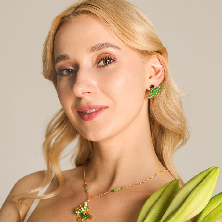 Get ready to open your jewelry box to a whimsical dream of the Emerald City with these Green Butterfly Earrings. The enamel-dyed wings, like lotus leaves kissed by morning dew, flow in gradient green hues, embodying the poetry of nature. The deep green gemstone at the top, resembling dewdrops collected at the heart of the butterfly, blends with the golden outline, capturing the butterfly silhouette at your ears. Wearing them, anyone can transform the freshness and romance of a spring garden into an enchanting detail, perfect for casual outfits or special occasions.