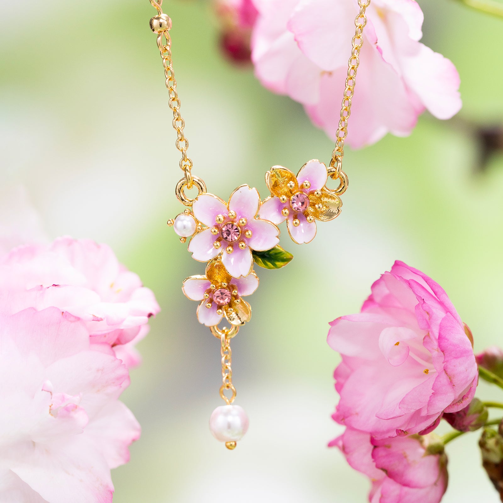 A delicate branch of cherry blossoms rests elegantly along a fine 18K Gold Plated chain, with soft enamel petals adding color and depth. This dainty, nature-inspired necklace brings a touch of springtime charm to everyday wear or special occasions. Perfect as a Gift for Her or a whimsical addition to your jewelry collection.