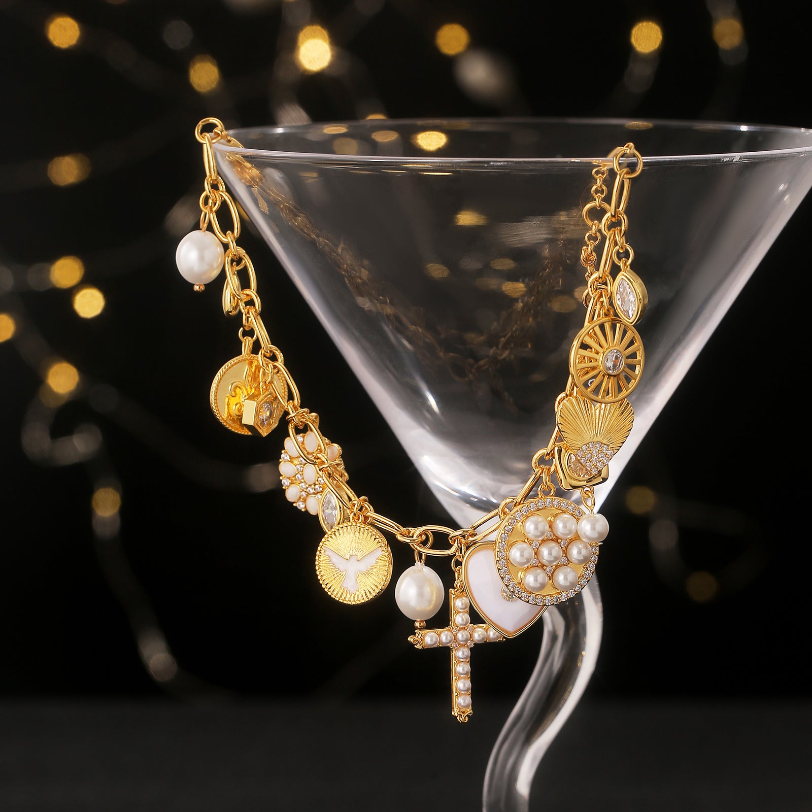Brățara Vintage Charm Cross are un lanț auriu împodobit cu o varietate de farmece unice, inclusiv o cruce, inimă, perle și motive geometrice, creând un aspect atât ornamentat, cât și elegant. Perfect pentru purtarea zilnică sau pentru asociere cu ținute elegante, adaugă o notă de rafinament și individualitate.