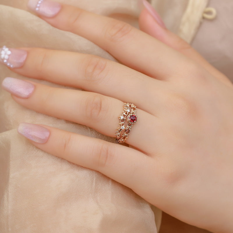This vintage garnet stacking ring set looks like a tiny treasure found in an old jewelry box, glowing with a warm berry-red shine. Each ring is slim and gentle, made for easy layering, so you can wear them one by one or stack them into a little boho constellation on your fingers. The garnet stones stay crystal-bright, catching the light with every move, giving the set a quiet but irresistible charm.